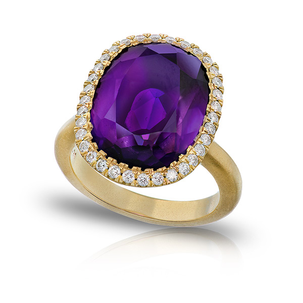 AMETHYST STAR RING WITH NEAR COLORLESS DIAMONDS CRAFTED IN 18K YELLOW GOLD WITH BRUSHED FINISH, 6.45 CTW
